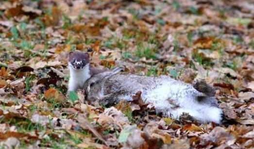 (圖為一隻白鼬捕獵到一隻體型比自己大得多的兔子)白鼬一般都喜歡在夜間行動,它們的視覺和聽覺都非常靈敏,動作更是靈活得不像話,當發現獵物的時候,白鼬會馬上讓自己的身體貼近地面,然後悄悄地向獵物匍匐前進,在夜色以及保護色的雙重掩護下(註:白鼬的毛色會隨著季節的不同而產生相應的改變,比如說在冬天的時候,它們的毛色就會變成白色),白鼬的獵物很難察覺到地球上最萌的掠食者正在向它們逼近。在時機成熟以後,白鼬就會毫不猶豫地暴起攻擊,白鼬咬合力非常強大,它們長而鋒利的犬齒可以輕易地刺穿獵物的頭部和頸部,從而導致獵物很快就一命嗚呼。捕獵成功的白鼬通常會將獵物拖到相對僻靜的地方,然後才會開始進食,它們為什麼會這麼做呢?這是因為雖然白鼬號稱是站在食物鏈的頂端,但因為它們的體型很小,平均體重只有2兩左右,所以常常會被大自然中其它的掠食者“欺負”,以下就是人們拍攝到的一個典型的例子。