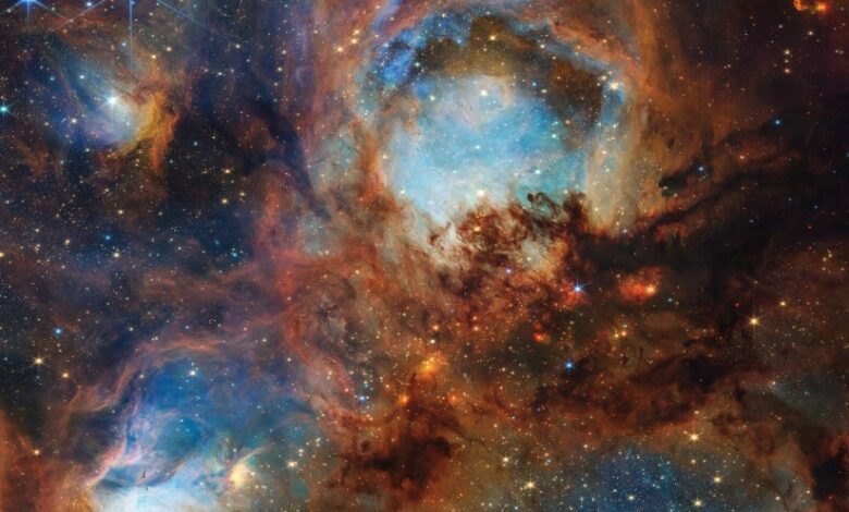 仔細看畫面細節,上方中央有一個圓圓、層層堆疊的結構,天文學家暱稱為「歌劇院」。這個區域會發藍光,可能是來自底部一顆明亮的黃白色恆星,也可能有顆還藏在厚厚塵埃後面的星星在發亮。那層橘棕色的塵埃下方,可看到一顆有繞射尖芒的黃色恆星。雖然輻射清除附近物質,仍有許多氣體和塵埃沒完全掃除,於是四周形成一圈緊密包裹的殼層。