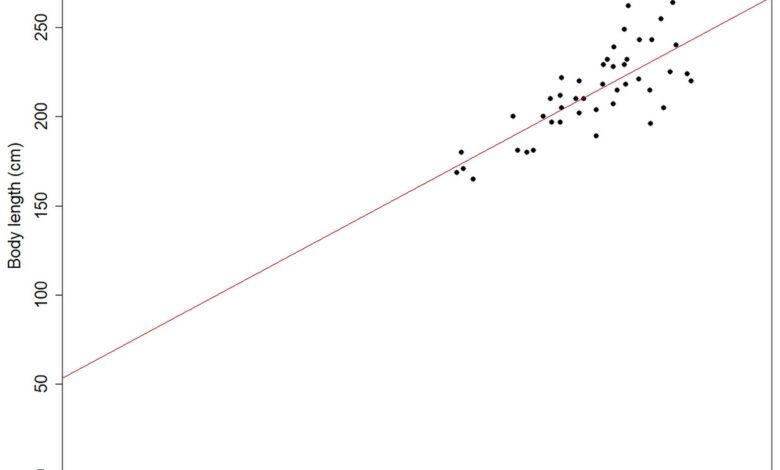 圖片顯示南美海獅的牙齒長度與身體長度呈現明顯的正相關,牙齒越長的個體通常體型也較大,說明牙齒大小能作為推估海獅身體發育狀況的有效指標。(圖/《PeerJ)》