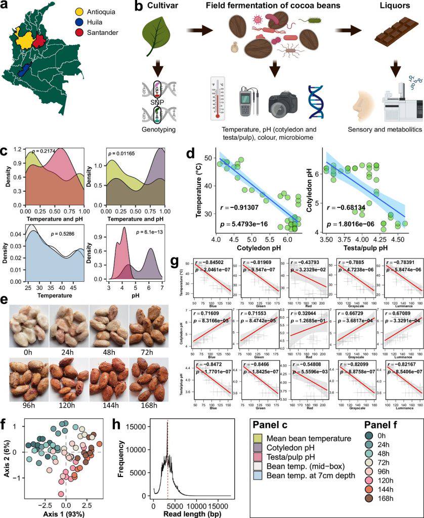 a) 地圖顯示哥倫比亞三個研究地區:桑坦德(Santander)、烏伊拉(Huila)、安提奧基亞(Antioquia)。 (b) 發酵實驗流程圖:從可可品種的基因鑑定,到田間發酵監測(溫度、pH、顏色)、微生物定序分析,再到後續的感官測試與代謝分析。 (c, d) 顯示豆子內部溫度與 pH 值的分布與相關性,證明兩者高度相關,且與外層組織的酸鹼變化同步。 (e) 展示可可豆在 0 小時到 168 小時發酵過程中的外觀顏色變化,從白色逐漸變為深褐色。 (f, g) 利用 PCA 與相關性分析,量化豆子顏色的改變如何與溫度和 pH 變化相連動。 (h) 展示奈米孔定序的讀長分布,平均讀長約 3,326 bp,確保微生物群落定序的可靠性。圖/《Nature Microbiology》