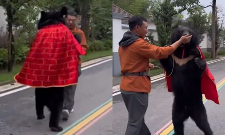 安徽宣城市皖南野生動物園,其園內有頭黑熊能夠披著袈裟站立走路,讓人嘖嘖稱奇,還被懷疑是不是有工讀生假扮。從曝光的影片顯示,一頭披著袈裟,能夠站立走路的黑熊,與工作人員在園區內人流較少的地方互動,接著該頭黑熊又在工作人員拿著食物並牽引,以雙腳往前走。