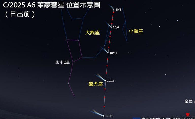 10月星空堪稱熱鬧的天象接力,從彗星到流星雨、行星合與月掩亮星,多樣而精彩。台北天文館表示,今年初才被發現的C/2025 A6「萊蒙彗星」近期快速增亮,10月初可望達到約4等,至10月21日通過近地點時更可升高到3等,成為少見的肉眼彗星,建議10月上旬可於日出前朝東北方嘗試搜尋;中旬後則於日落後朝西北西方向觀察,透過雙筒望遠鏡可更容易辨識出其棉絮般獨特身影。