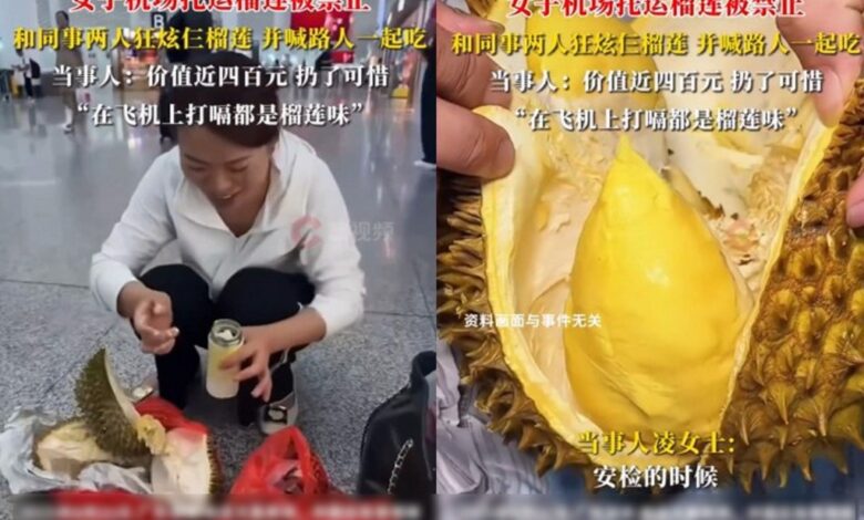 一名女子出門旅遊,花了400元人民幣(約1666元新台幣)買了一顆大榴槤,原本想帶回家跟家人享用,沒想到到機場託運時,被機場人員表示榴槤禁止託運,因為味道太重了,會影響到其他乘客,女子為了不浪費,在機場當場嗑了起來!
