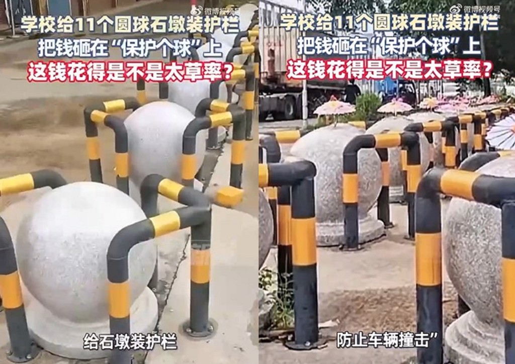 這起特殊的事件發生於廣東省的嶺南工商第一技師學院大門外。據了解,當初為了美化校園景觀,特別在校門口擺放了總共十一個圓形石球,此舉同時也能夠防止車輛不慎闖入校園內部。然而,近日校方卻耗費了一筆資金,在這些圓形石球的兩側,額外加裝了鐵製的防護欄杆,並聲稱這是為了保護石球本身,這樣的做法讓許多人質疑,這筆經費的花費是否過於草率。