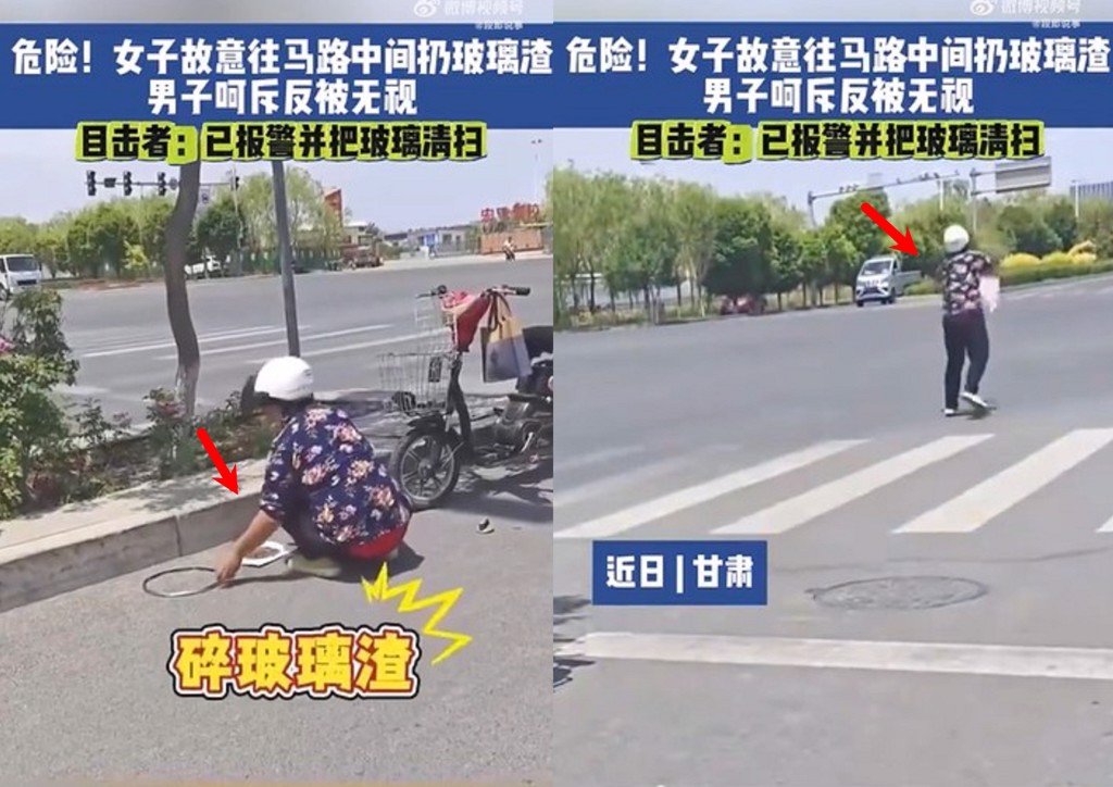 這個老太太在馬路上撒碎玻璃的事件發生在甘肅,當時路人發現她在路邊敲擊碎玻璃,感覺要做壞事,停下來用手機錄影,沒想到真的敲完碎玻璃後,直接走上大馬路,將碎玻璃撒了滿地。