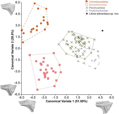 圖展示了對四個現生青蛙科(Limnodynastidae、Myobatrachidae、Pelodryadidae、Phyllomedusidae)與新發現化石種 Litoria tylerantiqua(標記為黑色星號)之髂骨(腸骨)形態的典型變數分析(CVA)結果。