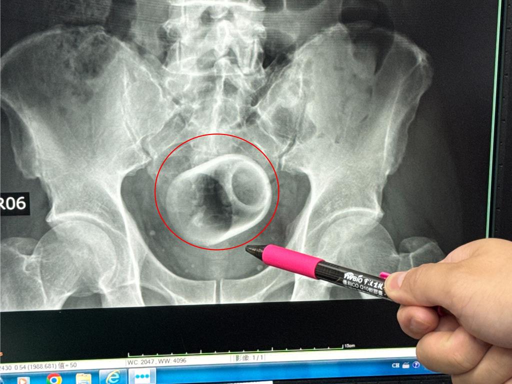該名患者到院時稱,已經3天無法大便很困擾,害羞不敢提及自己肛門塞了一個杯子,經過X光攝影,可見骨盆腔內有一個直徑約6公分、高約8公分的杯子,杯口朝下,自己當時見狀嚇一大跳,立即安排進手術室,要把杯子拿出來。