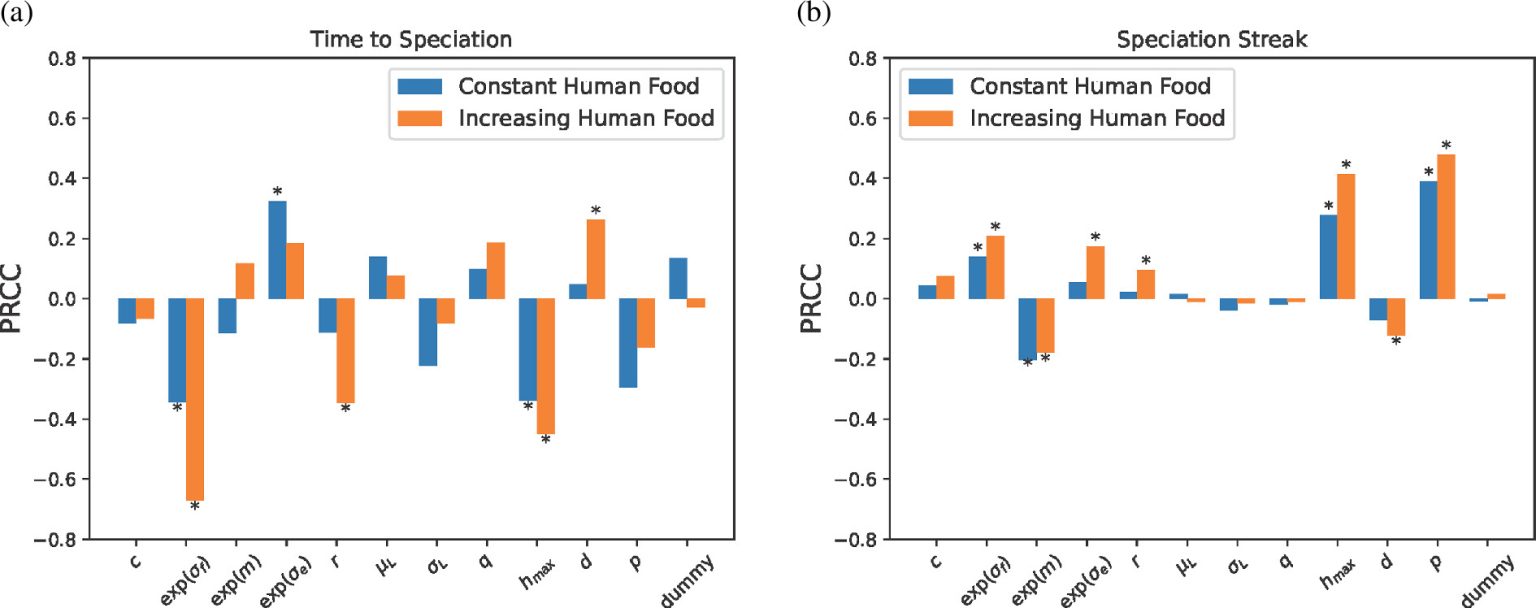 (a) 不同人類食物供應情境下,物種分化時間的部分秩相關係數(PRCC),反映各參數對物種分化所需時間的影響。(b)物種分化延續時間(speciation streak)的 PRCC 值,顯示各參數對維持亞群體獨立時間的影響。帶星號的數值表示統計上顯著異於零,代表該參數對結果有顯著影響。圖中藍色代表固定食物供應,橙色代表食物供應增加情境。(圖/《皇家學會會刊 B:生物科學》)
