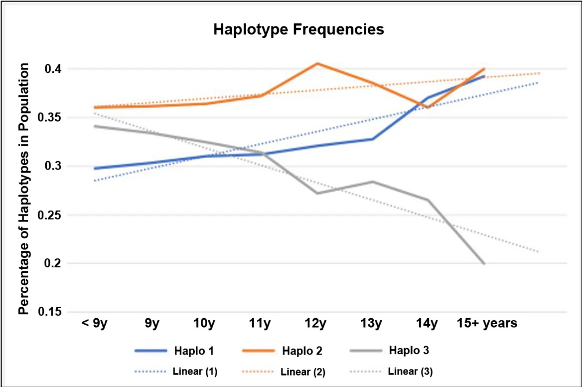 在年紀大的黃金獵犬中,某種基因組合(稱為「單倍型3」)較少出現;相反,另一種基因組合(稱為「單倍型1」)在年紀大的黃金獵犬中較常見。這些結論是基於381隻黃金獵犬的基因分析得出的。(圖/《GeroScience》)