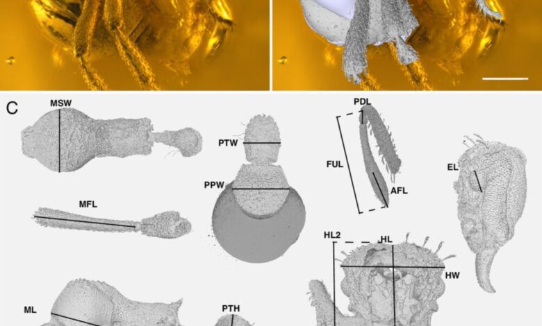 C 圖標示出多個測量項目,包括頭部、觸角、大顎、胸部與腿部等關鍵比例,幫助研究人員與現生物種進行比較,重建其演化位置與功能特徵。(圖/《英國皇家學會會報 B》)