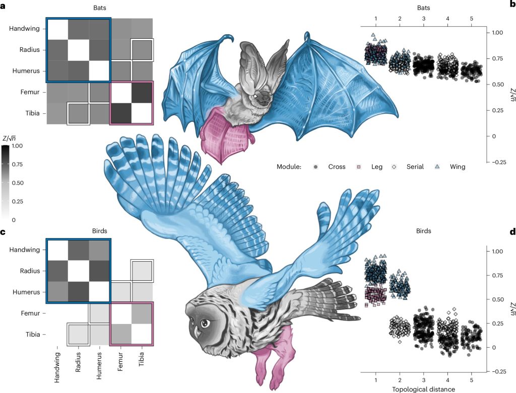 鳥類的翅膀與腿是獨立演化的,而蝙蝠的翅膀和腿的比例則是相互整合的。來源:Nature Ecology & Evolution (2024)